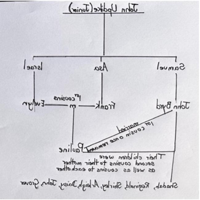When we started researching the history of these names, we soon discovered the complex family history of Pauline and John Byrd Updike and that one person in the photo (“Shirley Updike”) is incorrectly identified.